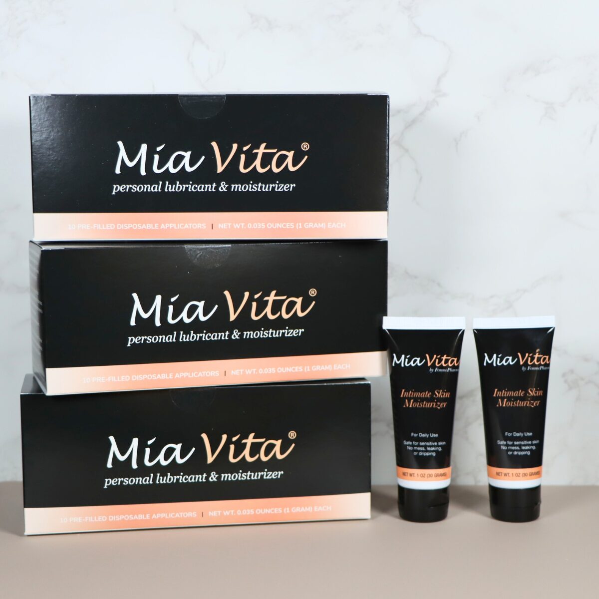 3 boxes of Mia Vita® Personal Lubricant & Moisturizer (30 applicators) paired with 2 tubes of Mia Vita® Gel (NEW! 1 oz. each) to provide relief from vaginal dryness, itching, and discomfort.